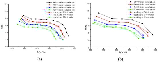 The high-speed emergency drainage pump studied in this paper will be applied in different conditions by adjusting the rotating speeds. Based on the experimental data and a rotating speed of 3800 r/min, similar flow rates and heads at rotating speeds of 3600 r/min, 3400 r/min, and 3200 r/min are obtained through Equations (7). Additionally, the true experiment results at rotating speeds of 3600 r/min, 3400 r/min, and 3200 r/min are given and compared, as shown in Figure 6a. The experiment results at rotating speeds of 3600 r/min and 3400 r/min are consistent with the corresponding scaling results under design flow rates, and the experimental value is slightly larger than the scaling value for small flow rates. However, when the rotating speed drops to 3200 r/min, there is a large deviation between the experimental result and the scaling result, the experimental values are far greater than the scaling values, indicating that the scaling of the affinity law has a certain scope of application. Beyond this scope, the affinity law will not be applicable.