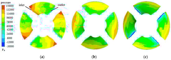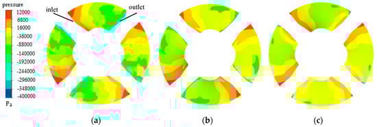 Figure 7 shows the static pressure on the impeller blades one the pressure side at different flow rates and a rotating speed of 3800 r/min. In general, the pressure on the pressure side of the blades increases gradually from the inlet to the outlet and from the hub to the rim. However, the pressure distribution under the flow rate of 0.8Qopt does not apply to this rule. As shown in Figure 7a, the pressure on the pressure side gradually decreases from the inlet side to the outlet side, and a relatively high-pressure area forms in the inlet area. As the flow rate increases, the maximum pressure and the high-pressure area gradually decrease, and the pressure gradient on the blades becomes more obvious. At the flow rate of 1.2Qopt, the low pressure area begins to appear in the inlet area on the pressure side, and the low pressure area gradually expands with the further increase of the flow rate.