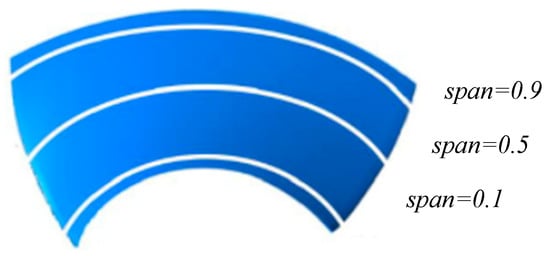 As shown in Figure 9, the radial coefficient span of the blade is defined as the dimensionless distance of the blade from the hub along the radial direction to the edge of the wheel rim.