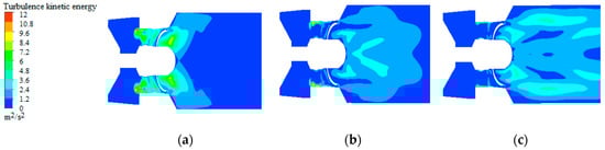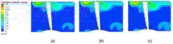 Distribution of turbulent kinetic energy at different flow rates: (a) 0.8Qopt; (b) 1.0Qopt; (c) 01.2Qopt.