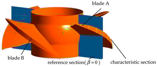 where νi is the normal velocity through the characteristic section in m/s; A is the area of the characteristic section in m2. The characteristic section is defined as the plane formed by two axial sections of the impeller and the extension surfaces of the pressure side and suction side, the impeller rim face, and the wheel chamber wall surface. The area containing the cross shaft and blade center is taken as the reference section. Based on this reference section, eight other characteristic sections are recorded by turning left or right by 10°, 20°, 30°, and 35°. A total nine characteristic sections are named as I, II, … IX, as shown in Figure 13.