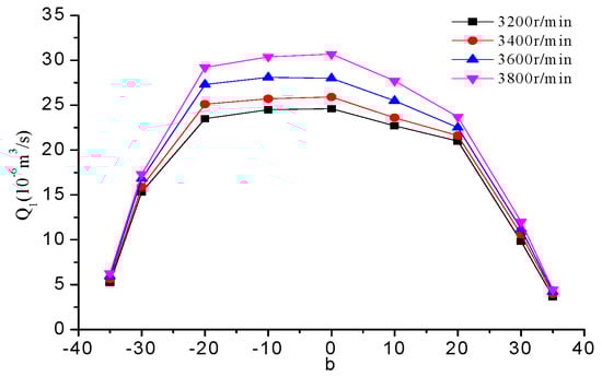 Figure 15 shows the variation trends of tip clearance leakage at different rotating speeds, with a flow rate of 1.0Qopt. The leakage increases first and then decreases with the change of chord length coefficient at various rotational speeds, and it gradually increases with the increase of rotating speed. The leakage reaches the maximum at the rotating speed of 3800 r/min. The blade tip leakage at different rotating speeds is disproportionate. As a result, the simulation value of the head at each speed is slightly higher than the scaling value; that is to say, the leakage does not meet the affinity law.