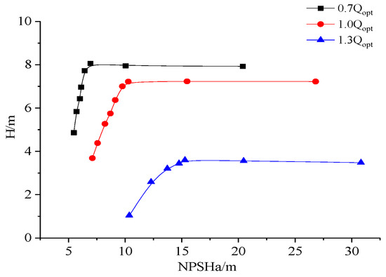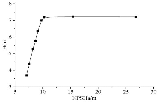 The cavitation characteristic of the emergency drainage pump was numerically simulated through altering the inlet pressure. The cavitation characteristic curve was obtained at the flow rate of 1.0Qopt and rotating speed of 3800 r/min, as shown in Figure 16. NPSHa is defined as,