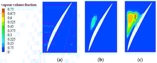 Vapor volume distribution on the impeller with different cross-section values: (a) span = 0.7; (b) span = 0.8; (c) span = 0.95.