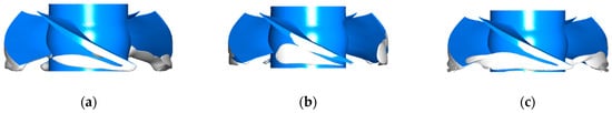 Cavitation distributions on the impeller at different flow rates: (a) 0.8Qopt; (b) 1.0Qopt; (c) 1.2Qopt