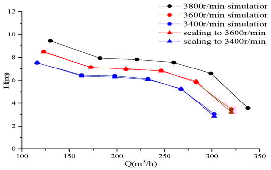 The Q-H characteristics of 1.15Qopt and 1.3Qopt at rotating speeds of 3600 r/min and 3400 r/min were simulated by adding the cavitation model. Based on the simulation result at 3800 r/min, similar flow rates and heads at rotating speeds of 3600 r/min and 3400 r/min are obtained again through Equation (7). Scaling and simulation results are all shown in Figure 21. Under large flow rates, the head simulation results at rotating speeds of 3600 r/min and 3400 r/min decrease significantly compared with Figure 6b, and the simulation results are closer to the scaling results. However, there are still some deviations. It is proven that the affinity law is slightly affected by cavitation at large flow rates.
