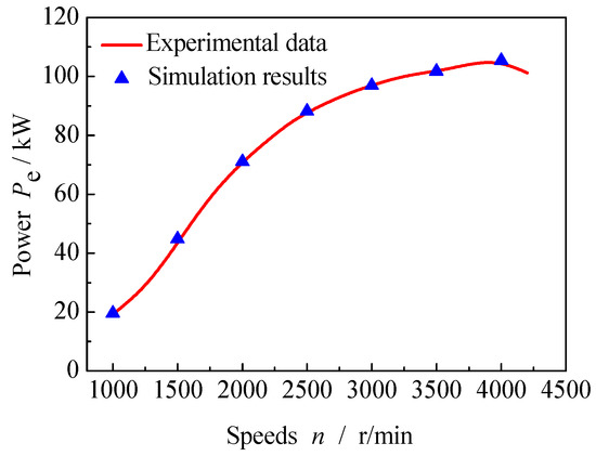 Comparison of experimental engine power with simulation results under full-load conditions.