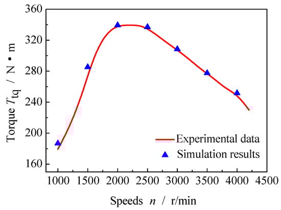 Comparison of experimental engine torque with simulation results under full-load conditions.