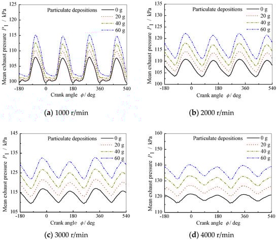 As shown in Figure 4, when the engine speed was 2000 r/min or 4000 r/min, under different engine loads, the mean exhaust pressure increased obviously with the increase in particulate depositions in the DPF. This is because particulate depositions affect the circulation performance of the DPF—the more particulate depositions, the worse the circulation performance of the DPF. The exhaust gas cannot be discharged through the DFP to the external envoriment, which leads to the increase in the mean exhaust pressure pre-DPF.