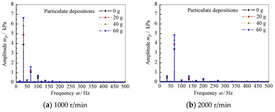 As shown in Figure 6, in the Fourier spectrum of instantaneous exhaust pressure, when engine load was 100%, under the same engine speed, although particulate depositions in the DPF were different, the maximum frequency amplitude corresponded to the same frequency. The frequency is described as the exhaust pulsation frequency of the diesel engine at this speed. In addition, with the increase in particulate depositions in the DPF, the frequency amplitude of instantaneous exhaust pressure with different frequencies increases, and the variation extent of the frequency amplitude under the exhaust pulsation frequency is the most obvious.