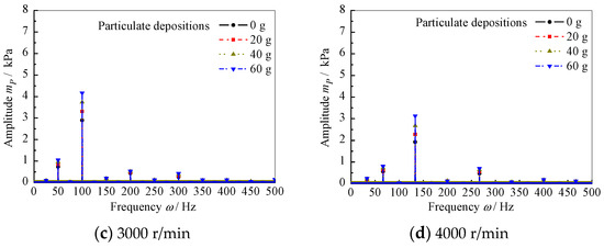 In addition, with the increase in engine speeds, the frequency amplitude under the exhaust pulsation frequency decreased gradually. Also, the increasing extent of the frequency amplitude under the exhaust pulsation frequency decreased gradually with the increase in particulate depositions in the DPF. When the engine speed was 1000 r/min, the exhaust pulsation frequency was 33.33 Hz. The frequency amplitudes under the same exhaust pulsation frequency were 3.9 kPa, 4.9 kPa, 5.8 kPa, and 6.6 kPa when particulate depositions in the DPF were 0 g, 20 g, 40 g, and 60 g, respectively. When the engine speed was 3000 r/min, the exhaust pulsation frequency was 100.00 Hz. The frequency amplitudes under the same exhaust pulsation frequency were 2.9 kPa, 3.3 kPa, 3.7 kPa, and 4.2 kPa when particulate depositions in the DPF were 0 g, 20 g, 40 g, and 60 g, respectively.