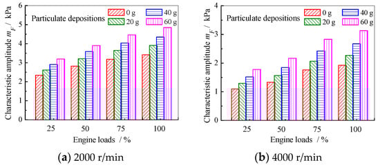 As shown in Figure 7, when the engine speed was 2000 r/min or 4000 r/min, under different engine loads, the frequency amplitude under exhaust pulsation frequency increased obviously with the increase in particulate depositions in the DPF. In addition, the frequency amplitude under exhaust pulsation frequency increased obviously with the increase in diesel engine loads, regardless of the engine speed. Also, compared Figure 7a with Figure 7b, under the same engine load, the frequency amplitude under exhaust pulsation frequency when the engine speed was 4000 r/min was smaller than when the engine speed was 2000 r/min.