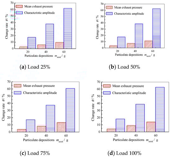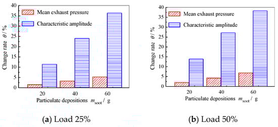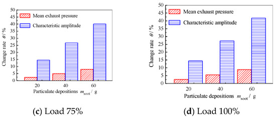 As shown in Figure 8 and Figure 9, despite engine conditions and particulate depositions in DPF, the change rate of the characteristic frequency amplitude was always greater than the change rate of mean exhaust pressure. Take Figure 9, for example, when particulate depositions in DPF increased from 0 g to 20 g, the change rates of mean exhaust pressure under different engine loads were less than 5%, while the change rates of characteristic frequency amplitude were greater than 15%; when particulate depositions in the DPF increased from 0 g to 40 g, the change rates of mean exhaust pressure under different engine loads were less than 10%, while the change rates of characteristic frequency amplitude were greater than 25%; when particulate depositions in the DPF increased from 0 g to 60 g, the change rates of mean exhaust pressure under different engine loads were less than 15%, while the change rates of characteristic frequency amplitude were greater than 35%.