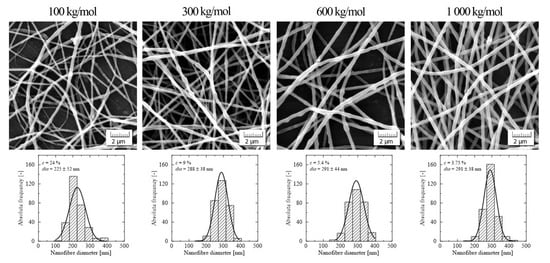 SEM pictures of nanofibrous mats for different poly(ethylene oxide) (PEO) solutions: Mw = 100 kg/mol, c = 24%; Mw = 300 kg/mol, c = 9%; Mw = 600 kg/mol, c = 5.4%; Mw = 1,000 kg/mol, c = 3.75%. The corresponding histograms describe the variance of nanofiber diameters.