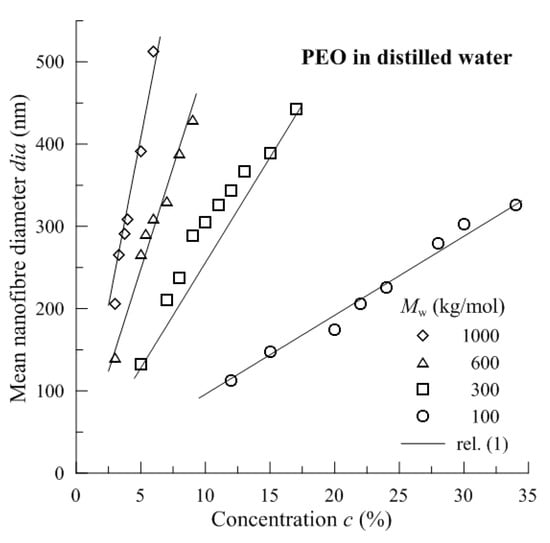 Due to a non-negligible number of entry parameters, the process of electrospinning cannot be simultaneously analyzed from all material, geometrical, and process aspects. It is always necessary to fix a substantial majority of entry parameters and concentrate on a moderate number of selected parameters. The impacts of the individual parameters are usually interlaced, and in the following analysis, we will pay attention to a mutual interplay between PEO molecular weight, PEO concentration, viscosity of a PEO solution in distilled water, and a mean diameter of the resulting nanofibers.
