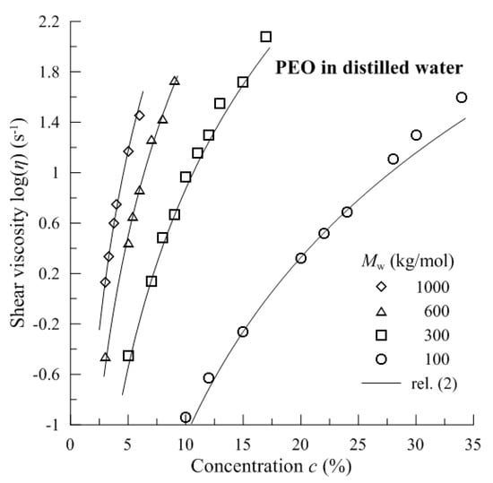 Dependence between shear viscosity, molecular weight, and concentration is a little more complicated. If we apply an analogous approach to that above, we obtain the correlation coefficients for the data sets (log(c), log(η)), again in close proximity to one (see Table 3). It justifies the proposal of a linear relation between log(c) and log(η). Unifying both a slope and an intercept with respect to the range of PEO molecular weights, a proposed relation is still algebraically simple.