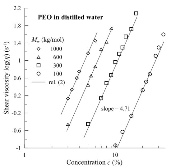 where b1 = 4.71, b2 = −0.82, b3 = 12.7, b4 = −48.8. As can be seen, Relation (2) is composed of two separate members, the first one expressing a contribution of concentration only and the second one (in brackets) representing the participation of molecular weight exclusively. Figure 3 documents the courses of the proposed predicted curves attaining a mean deviation of 6.3% in the semi-log coordinates (concentration-linear, shear viscosity-logarithmic), in fully linear coordinates, a mean deviation attained 11.8%. In the log–log coordinates (Figure 4), there is a linear dependence of shear viscosity on PEO concentration with the fixed slope attaining a value of 4.71.