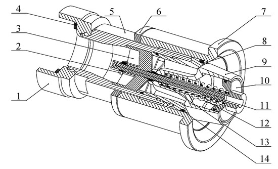 Structure of adaptive gun head. The labels are as follows: 1. Joint, 2. Nut, 3. Regulator, 4. Gasket, 5. Enclosure, 6. Ring, 7. Outer nozzle, 8. Inner nozzle, 9. Spray core, 10. Endcap, 11. Core rod, 12. Spring, 13. Core sleeve, and 14. Seal ring.