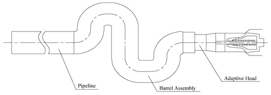 The connection between the adaptive gun head, the barrel, and the pipeline is shown in Figure 3. The electromechanical system installed on the barrel can realize the horizontal and pitching rotation of the fire-fighting monitor.