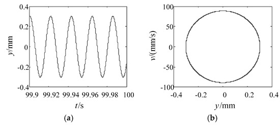 It can be seen from Figure 6 that the time course is periodically repeated, i.e., the phase diagram is repeated in a finite region, which is a closed curve, that is, there exists a limit cycle; the power spectrum density has a peak at an external excitation frequency of 46.8 Hz; Poincare map has only one point in a certain area. The above are obvious single-cycle vibration characteristics, indicating that when is 2%, is 0.6 MPa, is 46.8 Hz, and is 3 N, the jet system is in a single-cycle vibration state. The results of the bifurcation of a large number of samples show that when varies from 0 to 5%, ranges from 0 to 5 MPa, ranges from 0 to 100 Hz, and ranges from 0 to 5 N, the jet system operates steadily in a single-cycle.
