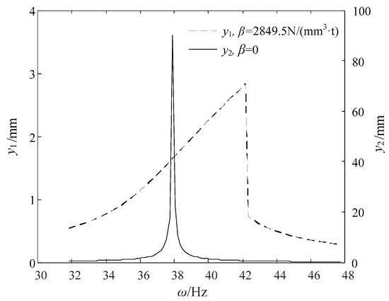 In order to explore the cause of the amplitude mutation of the jet system shown in Figure 5, the amplitude curve of the jet system with the external excitation frequency shown in Figure 7 was plotted with = 0.6 MPa, = 2%, = 3 N, and the nonlinear coefficient in Equation (9) had values of 0 and 2849.5 N/(mm3·t), respectively. In Figure 7, is the amplitude when N/(mm3·t), and is the amplitude when .