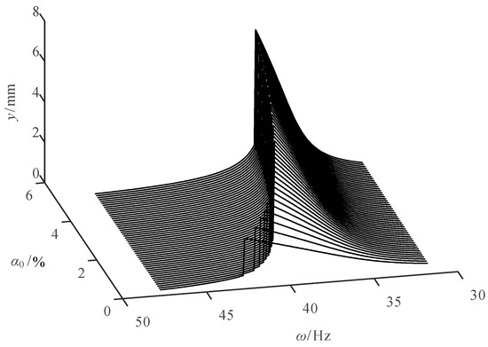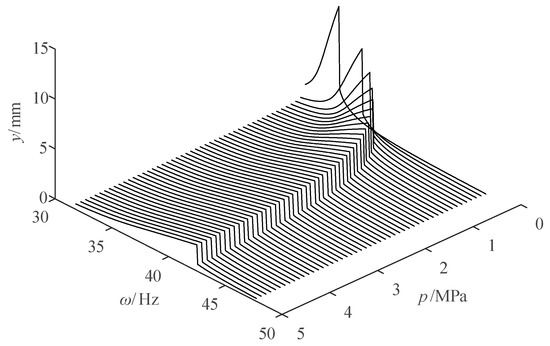 When , the dynamic equation of the jet system shown in Equation (9) can be regarded as a linear one. As can be seen from Figure 7, at the natural frequency of about 37.35 Hz, the amplitude reaches its maximum, which is 90.25 mm. Meanwhile, there is no amplitude mutation. In contrast, when N/(mm3·t), the dynamic equation is nonlinear, and the amplitude mutates from 2.833 mm to 0.7359 mm at the external excitation frequency of 42.18 Hz, which is greater than the natural frequency of the linear equation. From the above comparison, it is the nonlinear term that causes the amplitude mutation when the external excitation frequency changes. When the amplitude mutation occurs, the external excitation frequency is greater than the natural frequency of the corresponding linear system, and the maximum amplitude of the jet system is significantly reduced.