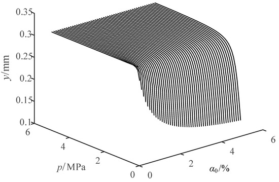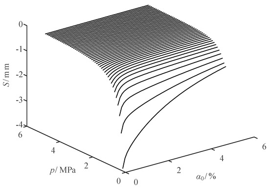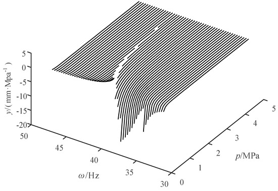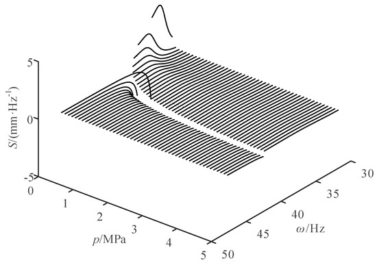 It can be seen from Figure 13 that in the low-frequency range before the amplitude mutation, the sensitivity of the amplitude to is negative. When is constant, the sensitivity gradually increases and approaches zero, as increases. When gradually increases, the sensitivity shows a stepwise distribution in the low-pressure region, which corresponds to the amplitude-variation tendency under low frequency and pressure, as shown in Figure 9. In the high-pressure region, the sensitivity gradually increases and approaches zero. In the high-frequency range after the amplitude mutation, the sensitivity of the amplitude to is positive. When is constant, the sensitivity gradually decreases and approaches zero as increases. When gradually increases, the sensitivity under the same pressure gradually decreases. Besides, when the frequency is relatively low, the shorter the pressure variation range, corresponding to the sensitivity variation curve of the high frequency and the larger the maximum sensitivity.