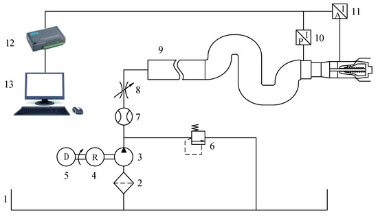 Experimental system for the dynamic test of the jet system. The labels are as follows: 1. Water tank, 2. Filter, 3. Pump, 4. Reducer, 5. Diesel, 6. Relief valve, 7. Flowmeter, 8. Throttle valve, 9. Adaptive fire-fighting monitor, 10. Pressure sensor, 11. Acceleration sensor, 12. Data Acquisition card, and 13. Computer.