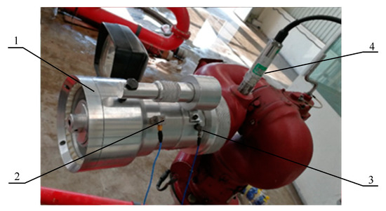 According to Figure 17, a platform for the dynamic experiment of the jet system of the fire-fighting monitor was built, which could collect data of the flow, pressure and acceleration of the jet system under different working conditions. During the experiment, the throttle valve was fully opened, and the diesel was used to adjust the system flow. Signals including the pressure signal at the entrance of the gun head were collected by the pressure sensor, and the acceleration signal of the enclosure the gun head collected by the acceleration sensor were transmitted to the DAQ card, and then the computer for data processing and display. The pressure sensor 10 was a MIK-P300 acceleration sensor from MEACON, the acceleration sensor 11 was a 603C01 single-axis acceleration sensor from PCB, and the data acquisition card 12 was a spider20E four-channel dynamic signal analyzer from Crystal Instruments. The fire-fighting monitor prototype and sensors are shown in Figure 18. The acceleration sensor 2 in Figure 18 could collect acceleration data in three directions, which could be used to evaluate the axial vibration state of the jet system. The acceleration sensor 2 was the 356a24 three-axis acceleration sensor of PCB Piezotronics, Inc.