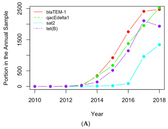 The historical occurrence profiles of the important genes and pathogens identified in Section 3.1 and Section 3.2 were plotted in this section to investigate the trend of antimicrobial resistance in the six selected countries. The genes and pathogens with an increasing trend were then identified from their profiles. For example, Figure 6A shows the profiles of the four antimicrobial genes with an increasing trend in the US dataset, while Figure 6B illustrates the profiles of the important clinical pathogens with a generally increasing trend in the US in recent years. In particular, the portion of E. coli and Shigella in the annual clinical samples went down from 2010 to 2013 and then generally went up after 2013. This pathogen was regarded as a pathogen with an increasing occurrence recently. The occurrence of Salmonella enterica generally increased from 2013, although fluctuation was observed over time. Similar profiles were obtained for the important pathogens from the other five countries, and pathogens showing a similar historical trend were regarded as pathogens with increasing occurrences. Table 3 and Table 4 list the genes and pathogens from Table 1 and Table 2 that show an increasing trend for each country.