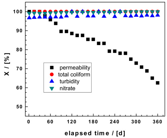 Changes of the hydraulic conductivity (permeability) were characterized by calculating the relative permeability “ϕ” (in%) at each filtration event using Equation (4):