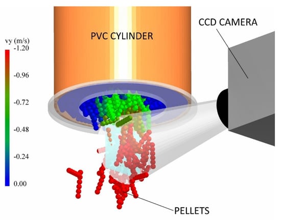 The camera frame rate was set to record at 500 frames per second. With a maximum resolution of 2016 × 2016 pixels and frequency of 500 fps, the CCD camera (LaVision Imager pro HS 4M) recorded 3600 pictures in a single shooting sequence, corresponding to a video length of 7.2 s. This interval was sufficient for all of the cylinder discharging process experiments. The recorded cylinder discharging process was evaluated using the PIV software DaVis 8.0.8 from the LaVision company. The aim was to determine the average components of vertical velocity vy of the pellets in the area just outside the outlet hole. Particle Image Velocimetry (PIV) is an optical method used to visualize flow. The results of a PIV analysis are typically a two-dimensional vector field. The cross-correlation method (in Davis LaVision software) was used to evaluate the PIV data. The images were separated into regular windows of the same size. A velocity vector was determined in each of these windows. The software stacked the corresponding windows from the first and second time slots and then shifted the images toward each other. For each position, the software then counted the signal match rate in each individual pixel to form a correlation map. From the best matches, peaks were created, and the resulting vectors subsequently determined from their positions. In the final stage, the average velocity of pellet movement from a scanned area could be obtained using the Davis LaVision software.