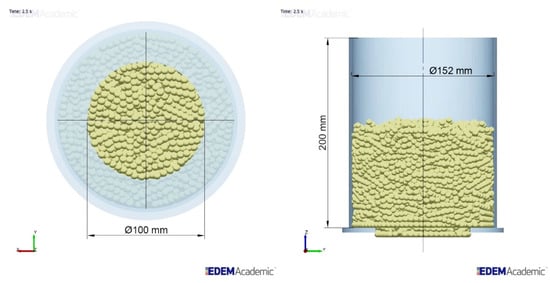 To obtain an assumed total weight of 1.5 kg in the DEM pellet sample, density values of 1650 kg·m−3 for t4, 1628 kg·m−3 for t5 and 1564 kg·m−3 for t6 were used. These values were determined by direct correlation.