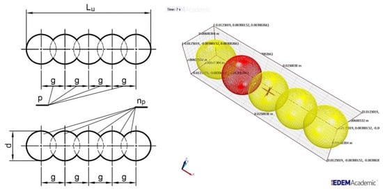 It was necessary to set the gap size between spherical particles in each cylindrical pellet, as well as the number of required spherical particles, as illustrated in Figure 5. This was based on the measured pellet length Lu. The number of spherical particles np making up the pellet was obtained by dividing the measured pellet length of Lu by the pellet diameter d, as given by Equation (1). This was rounded up to the nearest integer. The number of gaps between spherical particles p was calculated using Equation (2), and the gap size g was calculated using Equation (3).