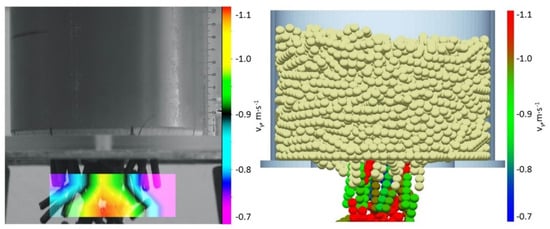 The objective of PIV and DEM measurement was to obtain average values of the vertical velocity component vy and the discharge time te. Ten measurements with the same settings were repeated with PIV. The values vy and te in both PIV and the DEM were evaluated at the moment 0.2 s after the outlet hole had opened. The reason for this was to exclude movement of the closure element at the cylinder’s opening from the video recording. This movement could have affected the PIV values of vy near the vector field area. The vector field area just outside the outlet hole in the PIV and DEM is illustrated in Figure 6. The total average velocity of the ten repeated PIV measurements outside the outlet hole was −0.71 m·s−1. The standard deviation was 0.26 m·s−1. The average discharge process time observed from ten measurements was te = 3.05 s, and the standard time deviation was 0.65 s.