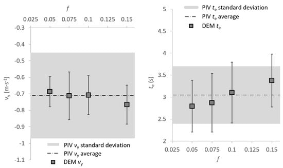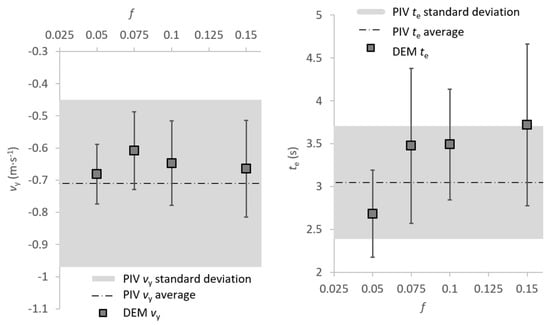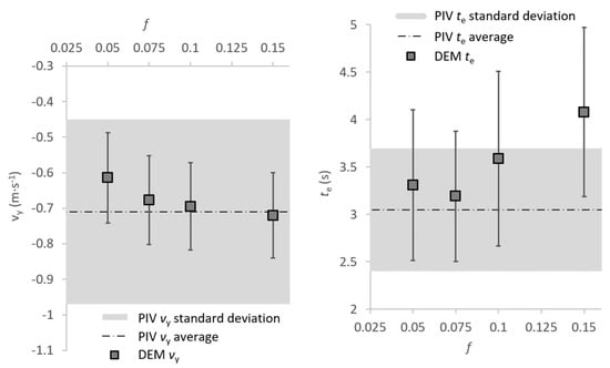 Comparison of the results of the DEM simulations and the PIV measurement for t4–t6 are given in Figure 7, Figure 8 and Figure 9. The individual figures show vy just outside the outlet hole on the left, and the times te on the right. Four values of vy and te are shown for frictions f = 0.05 to f = 0.15. Each vy and te value in the DEM was created as an average of ten simulations. The standard deviation zones and average values of vy and te in the PIV measurement are also indicated.