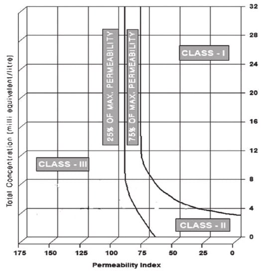 | Permeability Index (PI) | Salinity in Terms of Cations and Anions (meq/L) | Irrigation Water Class | |||||||
