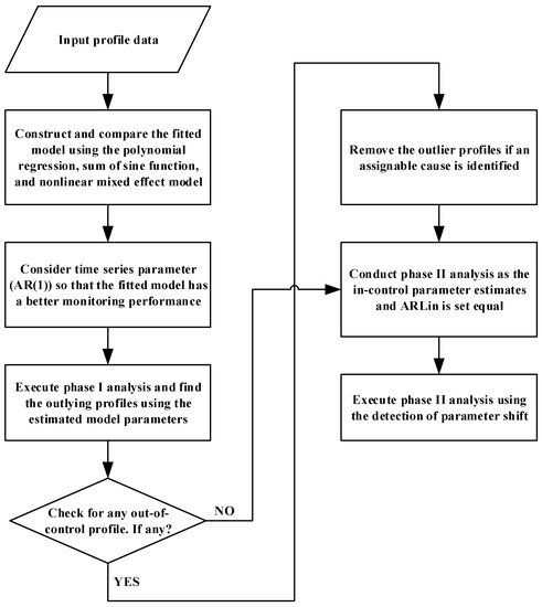In the proposed framework, three different models are investigated to seek an appropriate profile model. Additionally, the Hotelling T2 and the EWMA control charts are employed in order to monitor the profile shape and the profile residual, respectively. The flowchart is shown in Figure 1. First, the different process models are compared on the basis of , AICC, and SICC. According to the parameter estimates of the profile model, the nonlinear profile can be monitored and analyzed. In phase I, the Hotelling T2 control chart is used to evaluate the process stability and remove any outlying profiles. The Hotelling T2 control chart is also considered for phase II analysis via the out-of-control average run length (ARLOUT). An EWMA control chart is utilized to check the residuals of the fitted model if the autocorrelation effect is changed or not.