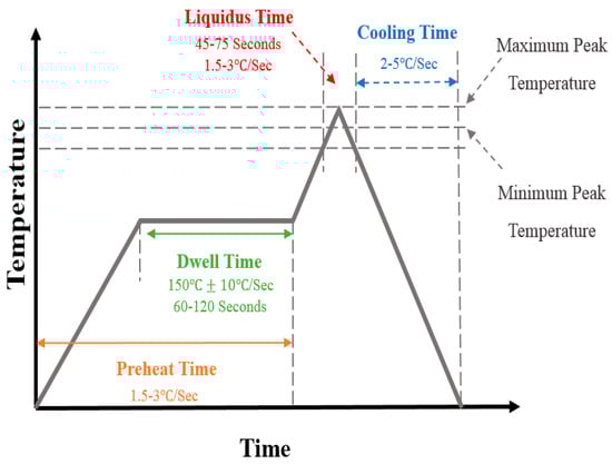 The operation of the reflow process is the heating sequence for assembling printed circuit boards (PCB) using solder paste at successively higher temperatures. As an assembly moves through a soldering system, it will perform a controlled temperature curve in order to achieve the required quality. Such a temperature curve is also called a “temperature profile”. The temperature profile is often measured along a variety of technical dimensions, such as slope, soak, time above liquidus, and peak. In general, reflow soldering processes contain four stages. Each operation presents a unique temperature profile: preheat, thermal soak (dwell), reflow (liquidus), and cooling. Figure 2 shows a typical example of a schematic temperature profile.