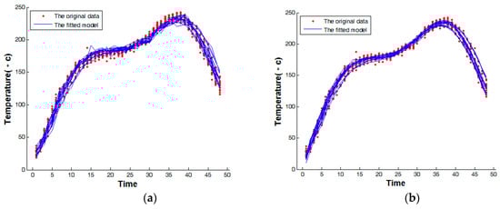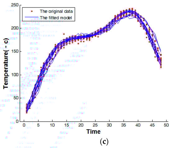 In this section, the polynomial regression model, the modified sum of sine functions, and the NLME model are first used to fit the reflow process data. The polynomial models of orders 3–5 and the modified sum of 1–3 sine functions are selected for model fitting. In every profile, n measurements in the ith random profile are collected over time, as indicated by , for and . The polynomial models are as shown in Equation (3). The modified sum of sine functions and the nonlinear mixed effects models are as shown in Equations (4)–(7).