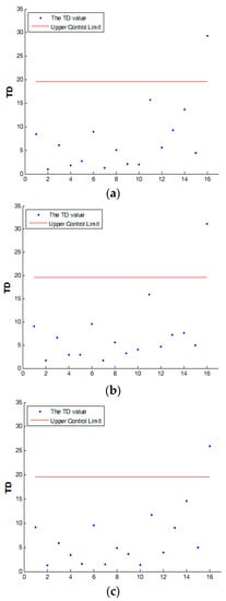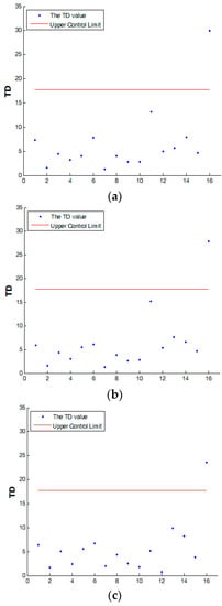 where k denotes the degrees of freedom and denotes the significance level. Sullivan and Woodall [] argue that the simulation results can be used to discover that the control chart (see Equation (9)) performs worse in detecting the step change and the ramp shift in the mean vector during phase I than the chart, as shown in (12). Based on this fact, in this paper, the control chart is employed to evaluate the different fitting models while identifying the outlying profiles.