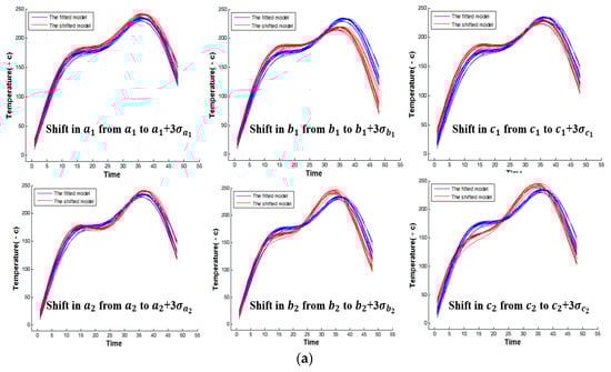 where denotes the input variable for the jth measurement, denotes the parameter vector in profile p (), and the term is defined, as in Equation (3). As mentioned above, the parameters and are the amplitude of the function, and determine the period, and and influences the horizontal shift. The parameter estimation is performed by using the nonlinear least squares estimation method (see []).