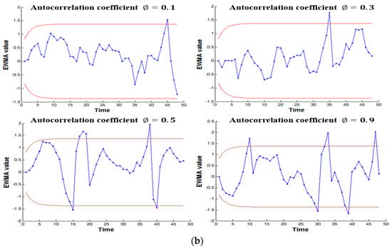 In the ordinary SMT operation, if the process recipe is suitably tuned before volume production, then the profile specification should be pre-determined and only subjected to a minuscule adjustment as a result of product changes. Therefore, seven different types of shifts are considered in our simulation study. The shifts of these process parameters are applied to the amplitude, the frequency, and the horizontal phase constant in the model, as shown in Equation (5). The simulation results of ARLOUT can be used to evaluate the on-line monitoring capability. These ARLOUT values are calculated by setting equally spaced parameter shifts every 100 simulated profiles (maximum ) and then averaging across 20,000 simulation cycles. The parameter shift in the scale of ranges from 0.5 to 3 for the six process parameters. Any parameter shift will cause the change of curve shape that is closest to the type of sustained shift in SPC practice. Figure 10a shows the comparative profiles under various shifts of different process parameters. In order to detect the autocorrelation effect in the residuals of each profile, the EWMA control chart is used to implement the related monitoring tasks using the different scales of the autocorrelation coefficient, from 0.1 to 0.9 (see Figure 10b).