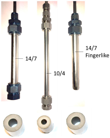 The membranes investigated in this study are thin-film palladium/silver membranes prepared by electroless plating on 100 nm asymmetric Al2O3 tubular supports provided by Rauschert Kloster Veilsdorf. Different support dimensions were used, as shown in Figure 1, in particular 10/4 mm and 14/7 mm outer/inner diameter (OD/ID). These supports were used in two different configurations, viz. with both sides open and with one side closed (referred to as “finger-like” supports). The finger-like shape is also porous and covered by the palladium/silver selective layer. Ceramic substrates were activated by immersion into a palladium acetate solution with a subsequent co-deposition of a Pd-Ag layer following the method by Pacheco Tanaka et al. [18]. The palladium concentration was modified according to the dimensions of the supports and the electroless plating process was carried out for 5 h for each membrane. Only membrane 5 (shown in Table 2) had 6 h of deposition. Palladium silver compositions were calculated after analysis of the samples taken from the ELP solution. The results of the characterization carried out by ICP-OES are summarized in Table 2. After the plating step, the metallic layer was annealed at 550 °C for 4 h in a reducing atmosphere (10% H2 and 90% N2).