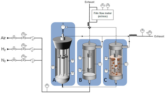 Three module configurations were used to study the stability of the membranes (Figure 2), using the same feed and outlet control and analysis systems (one module per time can be used in the permeation setup). The feeding of hydrogen, nitrogen and air (or a mixture of them) was controlled by Bronkhorst mass flow controllers. Membrane module configuration A allows testing of five membranes at once in a single permeation module; this ensured that all the membranes were exposed to exactly the same conditions. The permeate of each of the five membranes can be measured individually. Configuration B is a permeation module where a single membrane was tested. This same module allows for the integration of the membrane in a fluidized bed, as shown in configuration C; the fluidized bed material consisted of Rh/Al2O3 particles with an average particle size of 180 µm. The pressure in the system was controlled using a backpressure regulator. The permeate flow rate from the membrane was measured using a Horiba VP film flow meters. For the hydrogen flux the Horiba VP-4 (1–10 L min−1) was used, whereas for the nitrogen flux the Horiba VP-1 was used (0.2–10 mL min−1). In some cases, the nitrogen flow rate was below 0.2 mL min−1, in which case the flux (for the calculation of the perm-selectivity) was set at 0.2 mL min−1 with the indication that the actual flux is smaller than this value. Each experimental point is an average of three measurements within an error of 1%.