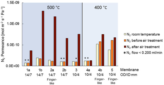 Air treatment is usually performed to stabilize and increase the hydrogen flux [22,23,24]. Roa et al. have shown that the air treatment had more than a cleaning effect on the surface of the membranes and also caused morphological changes of the surface [25]. However, it has been reported that air treatment also increased the nitrogen flux indicating the formation of pinholes. The membranes in this work were heated up to the desired temperatures under nitrogen; at this temperature, the nitrogen permeation was measured followed by an air treatment. The air treatment was performed by flushing a 50:50 air/nitrogen mixture into the system for 2 minutes; for membranes 1a, 1b, 2a, 2b and 3 at 500 °C, and for membranes 4a, 4b and 5 at 400 °C respectively. After the treatment, the nitrogen and hydrogen flux were measured again. The obtained permeation results are reported in Figure 3.