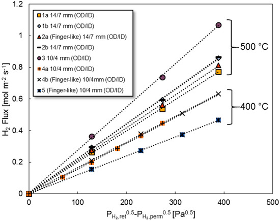 The results show that the nitrogen permeance after the air treatment increases between 400% and 700% at 500 °C, which is significantly more than 10% to 30% at 400 °C. The increase in nitrogen permeance could be the result of a rearrangement of the palladium surface because of oxidation, which may cause defects. The formation and connection of defects through the palladium layer as a result of this rearrangement could subsequently result in the formation of pinholes. The results show that this effect is more pronounced at higher temperatures. This can be related to the higher reaction kinetics of palladium oxidation at higher temperatures, which results in a faster and less structured rearrangement [26]. The air treatment did not show significantly different effects for the finger-like membrane compared to the other membranes, indicating that the graphite ferrules in the sealing are not significantly affected by the air treatment, both at 400 °C and 500 °C. The hydrogen flux increased from 70% up to 110% compared to the case before the air treatment; this is expected and comparable to the increases reported before in the literature [22]. The ideal perm-selectivity ranged, after the air activation, between 7500 and 9000 at 500 °C for these membranes. In Appendix A the ideal perm-selectivity of all the membranes at different times in this study is presented. The results of the permeation test for all the membranes at their initial conditions are shown in Figure 4. The permeation flux of all membranes after activation showed good correspondence with the transmembrane difference of the square root of the hydrogen partial pressure, indicating that the hydrogen flux is only limited by bulk diffusion of hydrogen in the palladium layer. Both parts of membrane 1 and 2 showed almost the same hydrogen permeance, whereas the permeance of membrane number 3 was found to be 1.2 times higher than that of membrane 1 and 2. We can relate this difference to a minor difference in the (thickness of the) selective layer and not to differences in the dimensions of the support, since the pressure exponent showed a good fit with 0.5 for all membranes, indicating no effect of the support. Membrane 4 showed a higher permeance compared to membrane 5, which can be explained by the longer time of the ELP process of membrane 5 which was expected to result in a slightly thicker Pd-Ag layer, lowering the hydrogen permeance.