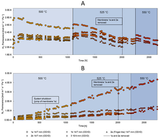 Long-term hydrogen permeance (A) and nitrogen permeance (B) of membranes 1a, 1b, 2a, 2b and 3 at 500 °C, 525 °C and 550 °C.