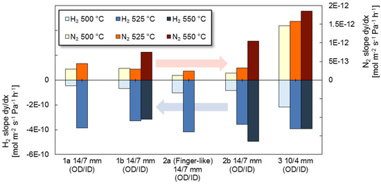 To further compare the long-term behaviour of the membranes both the time derivative of the hydrogen and nitrogen permeance were calculated and compared for each temperature (see Figure 6). In the calculations of the slopes the initial increase was not considered for the hydrogen permeation. The hydrogen permeance has a negative slope as the permeation decreases over time; it is clear that the slopes become more significant at higher temperatures. The decrease in hydrogen permeability is possibly related to surface deformation, of which the rate is increased at higher temperatures [27]. The surface transformations are further investigated in the post characterization.