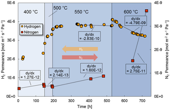 Slope of hydrogen and nitrogen permeance over time.
